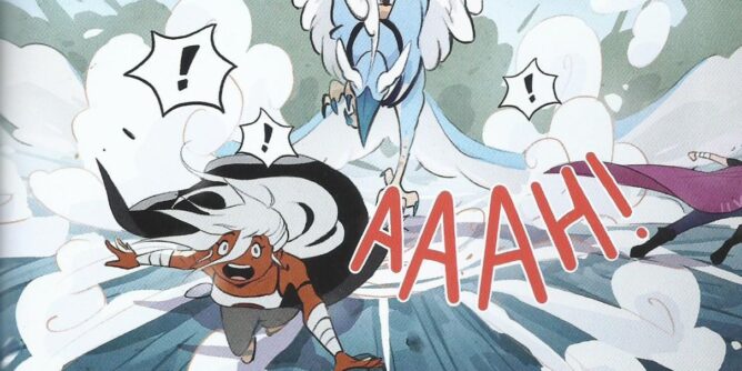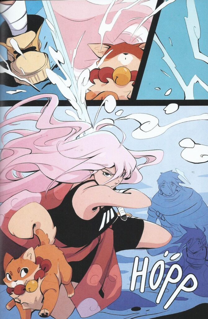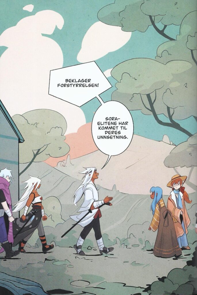 Bind 1, «Skyverdenen», er ein svært visuelt vakker teikneserie, med maleriske himlar og landsbyar, vakre dyr. Serieskaparen Tessa Nelissen er veldig spesifikk med fargebruken. Her er mange nyansar av blått, heilt frå ein iskald blå i grotter til varmblåe skyer over landsbyen Harestad. Den andre fargen vil eg karakterisere som terrakotta, ein slags raud/oransje-nyanse. Under lanseringa i oktober fortalde ho at det blir andre fargar i dei komande binda. Mange serieskaparar i Norge har ein bestemt og gjenkjenneleg palett, men få er så spesifikke og bestemte i fargebruken som Nelissen. Det blir spennande å sjå korleis fargebruk og uttrykk forandrar og utviklar seg vidare i serien.