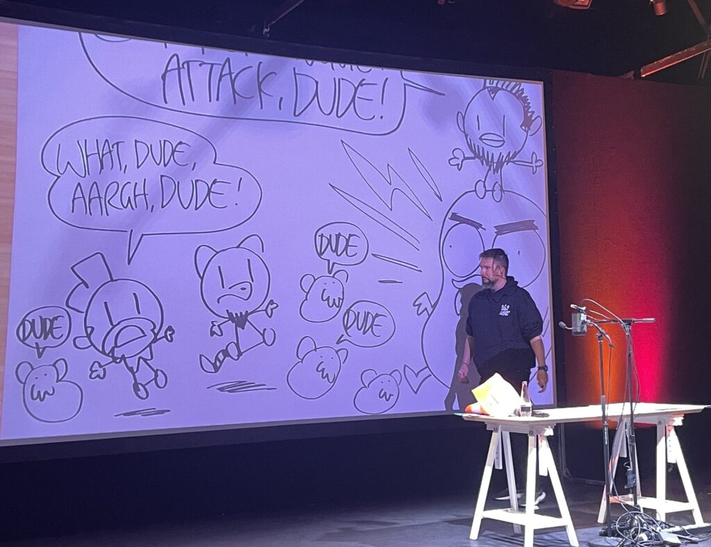 Hele timen var viet til grenseløs serieskaping og gleden av å jobbe med seriemediet. Meget interessant! Mannen har også flere innsiktsfulle anekdoter om serieskapere og forlag enn de aller fleste, så han måtte faktisk styre seg innimellom …