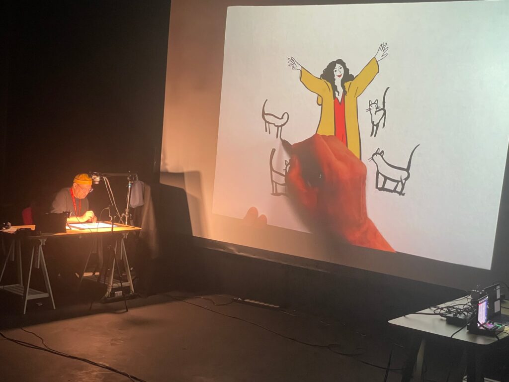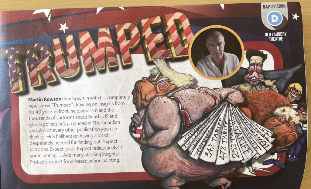 Mer tegning på storskjerm, noe som dro stemningen ned litt. Men så kom kveldens høydepunkt: live-show med satirikeren og karikaturtegneren Martin Rowson. Nesten en time med banning akkompagnert med tegninger fra The Guardian og andre kilder, syrlige vitser og rasende utbrudd mot verdens høyrekrefter og annen elendighet. Han avsluttet med å skape en Trumpbyste av søppelsekker, en parykk og matrester. Sterkt stoff av en utrolig dyktig illustratør.