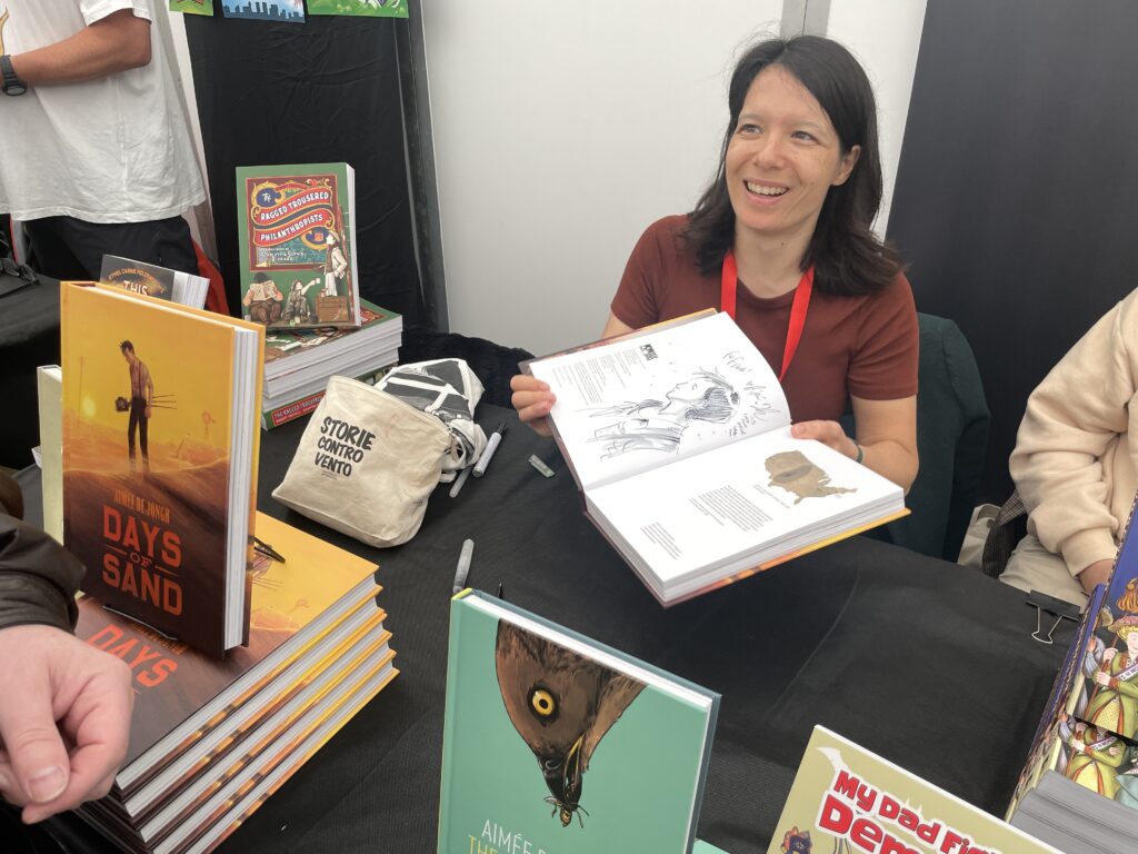 Litt fritid gjorde at vi fikk et sveip gjennom selvsamme hall, der man hurtig konkluderer at koffertvekt og økonomi sier «nei» til de aller fleste fristende tilbud. Kunne likevel ikke si nei til Aimée De Jong, som vi møtte på Bergen Tekst og tegning i juni. Hun hadde med seg bøker som hun omtalte den gang, så de ble prompte innkjøpt. En Rowson-illustrert Marx/Engels-bok var også nødvendig.