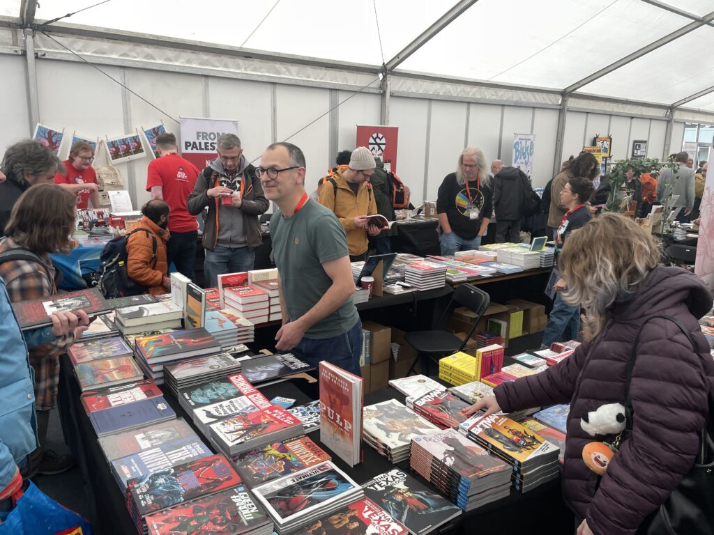 Markedsteltet var tomt, men i ferd med å bli rigget. Ved siden av lå et foredragstelt, der den amerikanske redaktøren Shelly Bond (kjent fra mange år hos Vertigo), gjennomgikk sine redaktørtips om hvordan unngå de verste brølerne. Salen var fylt av entusiastiske forfattere og unge forleggere som fikk en drivende god presentasjon om redaktørarbeid. Vi fikk også høre glimt fra hennes lange karriere – nesten 40 år. Gammelpunker still going strong!