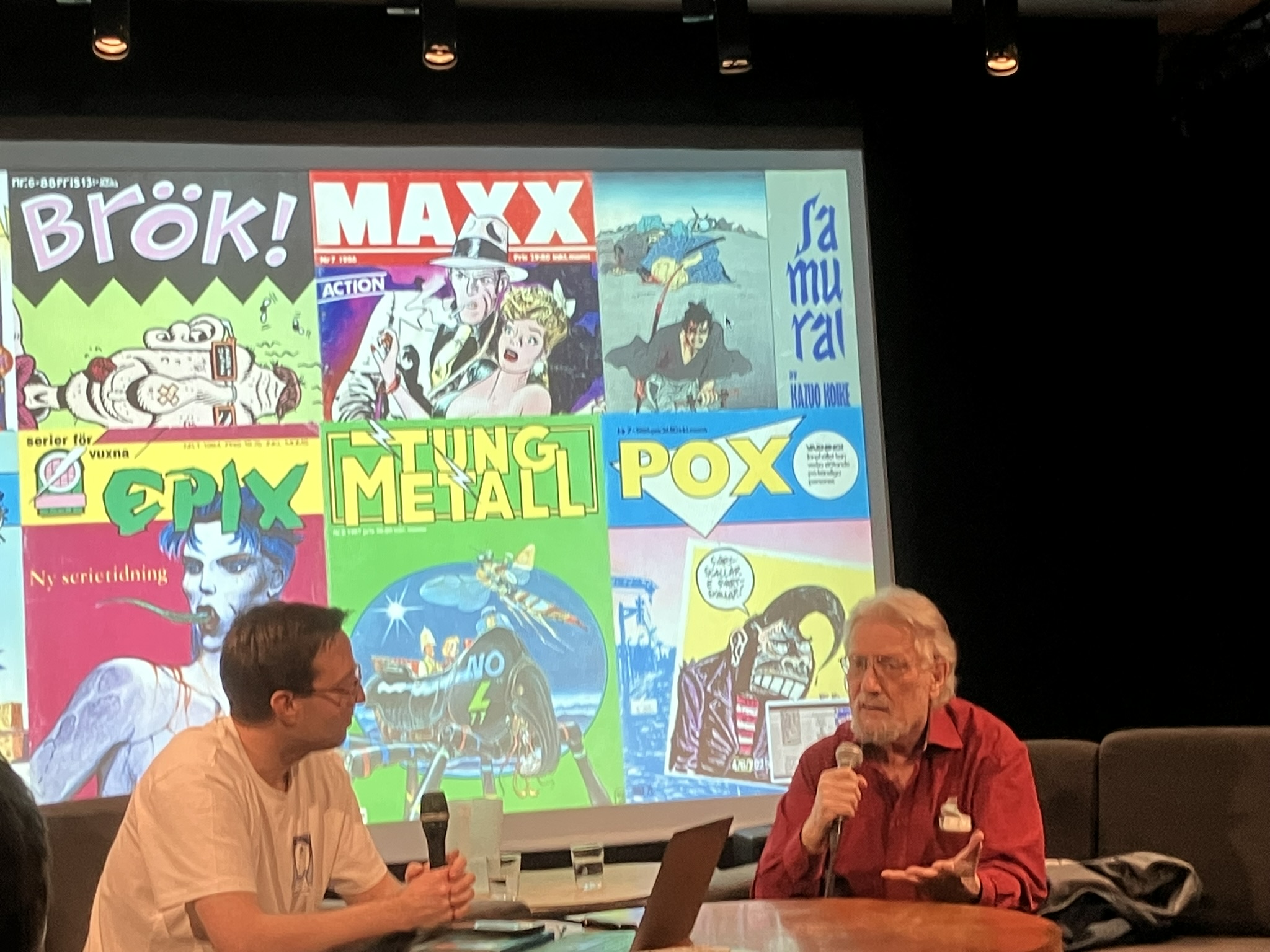 En fullsatt sal som møtte Horst Schröder og Robert Aman. Sistnevnte var opptatt av at han representerer noe annerledes i tegneserie-Sverige. Han har universitetsutdannelse fra Tyskland, og hadde derfor en akademisk tilnærming til tegneserier da han begynte å skrive om teamet for det svenske tegneserietidsskriftet Bild & Bubbla på slutten av 1970-tallet. Schröders tekster speilte datidens venstrevind, og han skrev kritisk om tegneseriemediet.