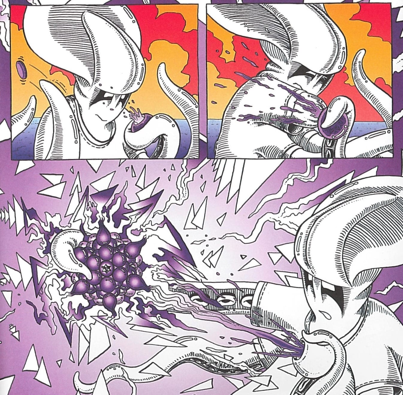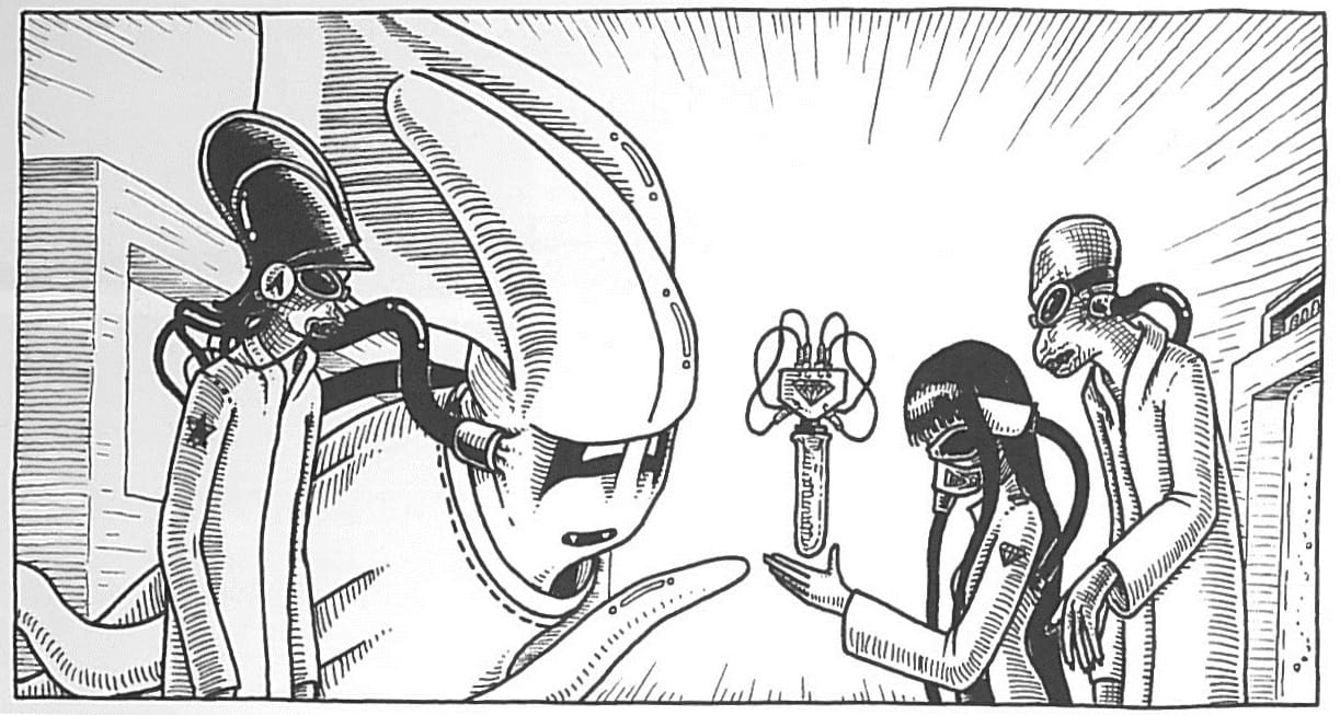 «Squidologi» (ja, stavet med i) er et rent grafisk, i betydningen fullstendig ordfritt, science fiction-epos (det nærmeste vi kommer ord er noen eksempler på alien-skrift). I seg selv er dette en god idé; selv om «Den Fjerde Veggen» hadde noen inspirerte øyeblikk i på tekstsiden, er Falla Eriksen suverent best på det rent grafiske. Jeg har tidligere beskrevet stilen hans som popkunst, og det er fortsatt relevant å trekke inn, men han tar også mye inspirasjon fra klassiske, europeiske science-fictionserier, og det er spesielt tydelig her. Litt manga er det også mulig spore i disse snaut 180 overjordiske sidene.