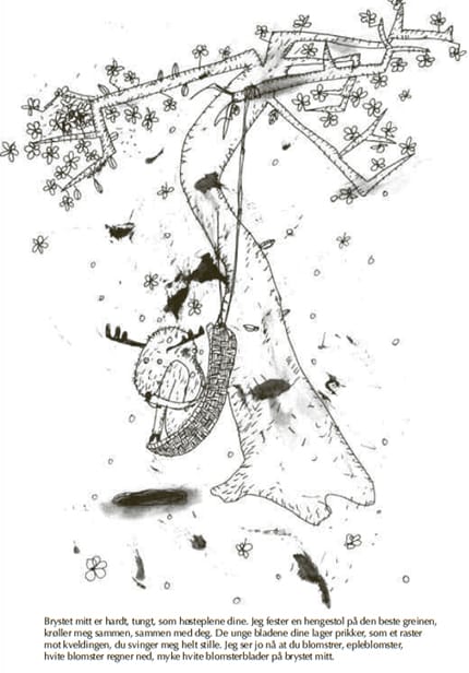Enda så personlig og melankolsk som boken er, har hun klart å holde på den barnlige og sjarmerende streken som jeg setter så pris på ved henne. Midt oppi all sorgen og lengselen glimrer det en barnlig naivitet og livsglede. De tidvis overveldende skoglandskapene satt opp mot hennes sjarmerende strek, ispedd blekk- og akvarellsprut gir det et helstøpt bilde av livshendelser og deres mangefasetterte aspekter. Det være seg sorg, glede eller fortapelse. Stemningene hun formidler i tekstene og illustrasjonenes samhandling viser helt uovertruffent hvor potent dette mediet er til å gjøre nettopp det. Anna Fiske er så rå at hun trenger ikke at noen tar av seg hatten for henne, men jeg gjør det likevel.